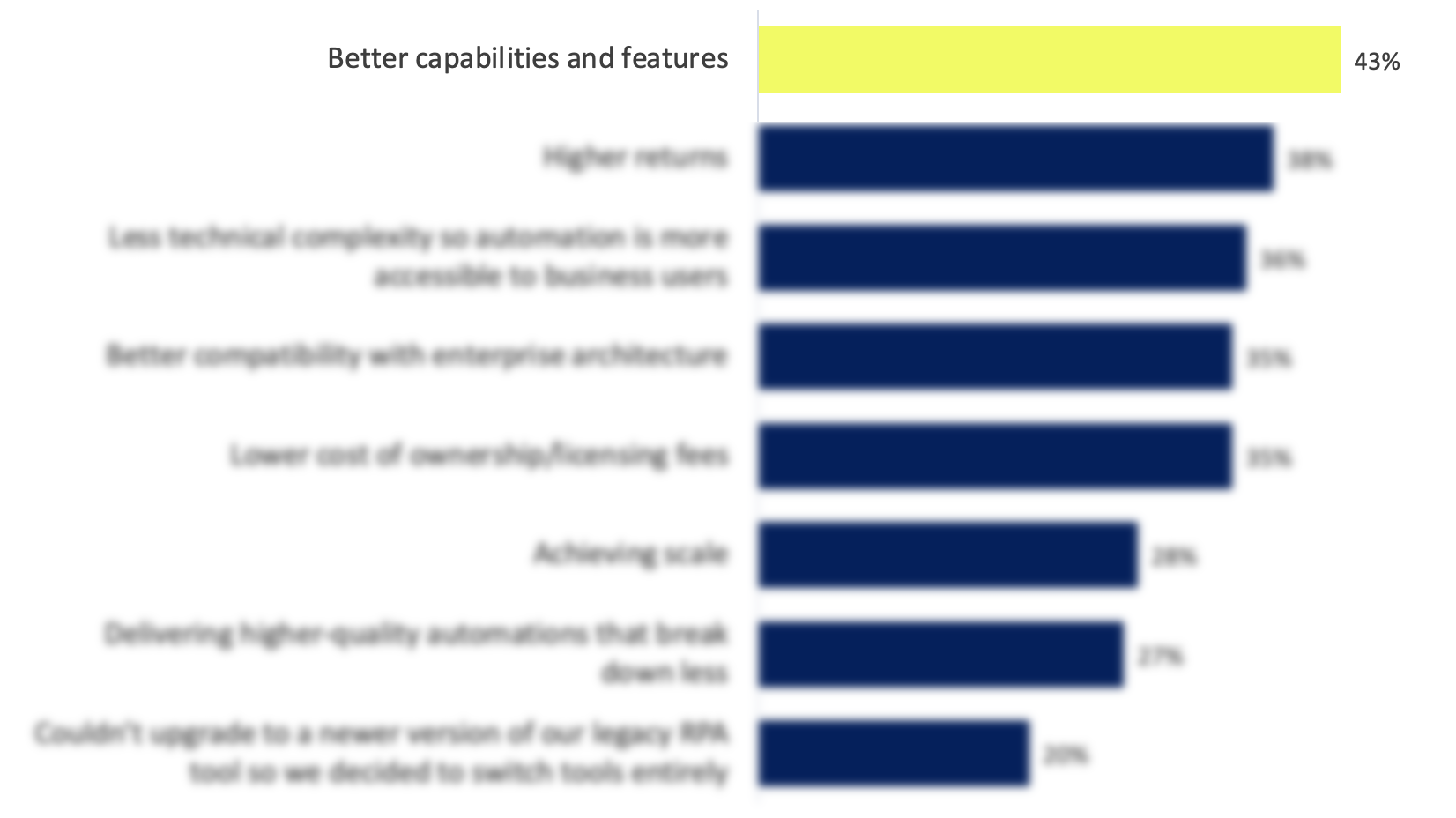 When surveyed, organizations who have already redeployed their automated processes to another RPA tool reported that leveraging better capabilities and features was the biggest motivator.