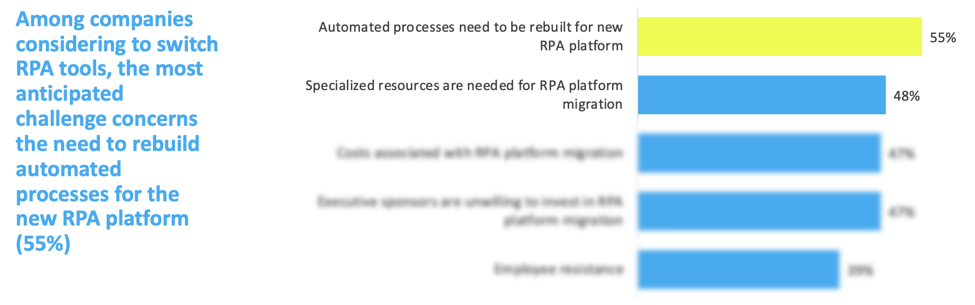 The need for support in any re-platforming effort is very real because RPA tools specify automations differently. For an automated process to work in another RPA platform, it must be investigated, understood, rebuilt, tested, and then deployed using highly-skilled, technical resources. It’s no wonder then that the greatest challenge organizations encountered while switching RPA tools was the need for specialized resources and the burden of rebuilding their automation estates from scratch.