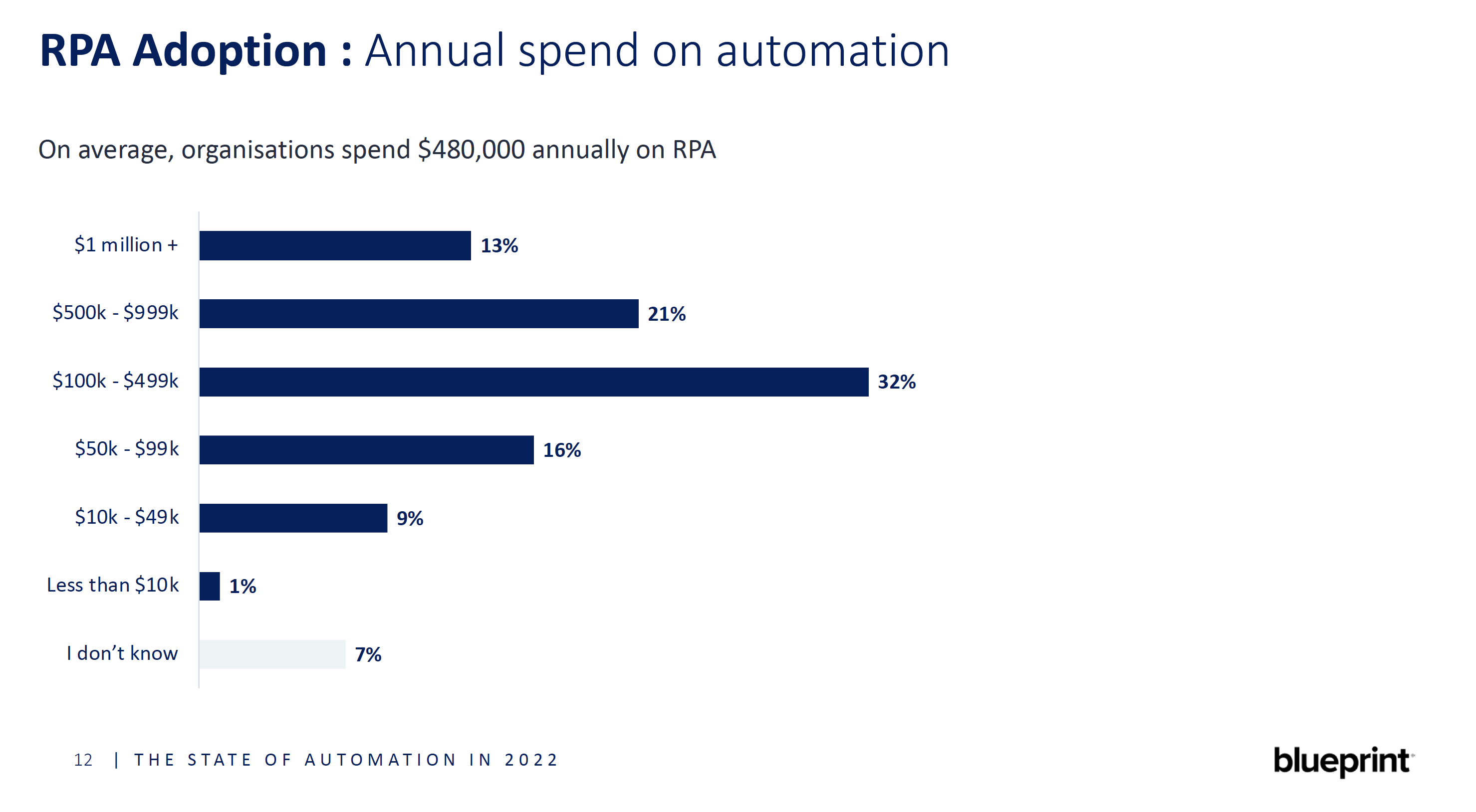 According to Blueprint's survey results, the cost of ownership or operational expense (OpEx) for automation is still relatively high. On average, organizations spend $480,000 on automation annually; however, 13% of respondents – most of which represent enterprise organizations with headcounts over 10,000 – reported that they spend over $1 million yearly on automation.