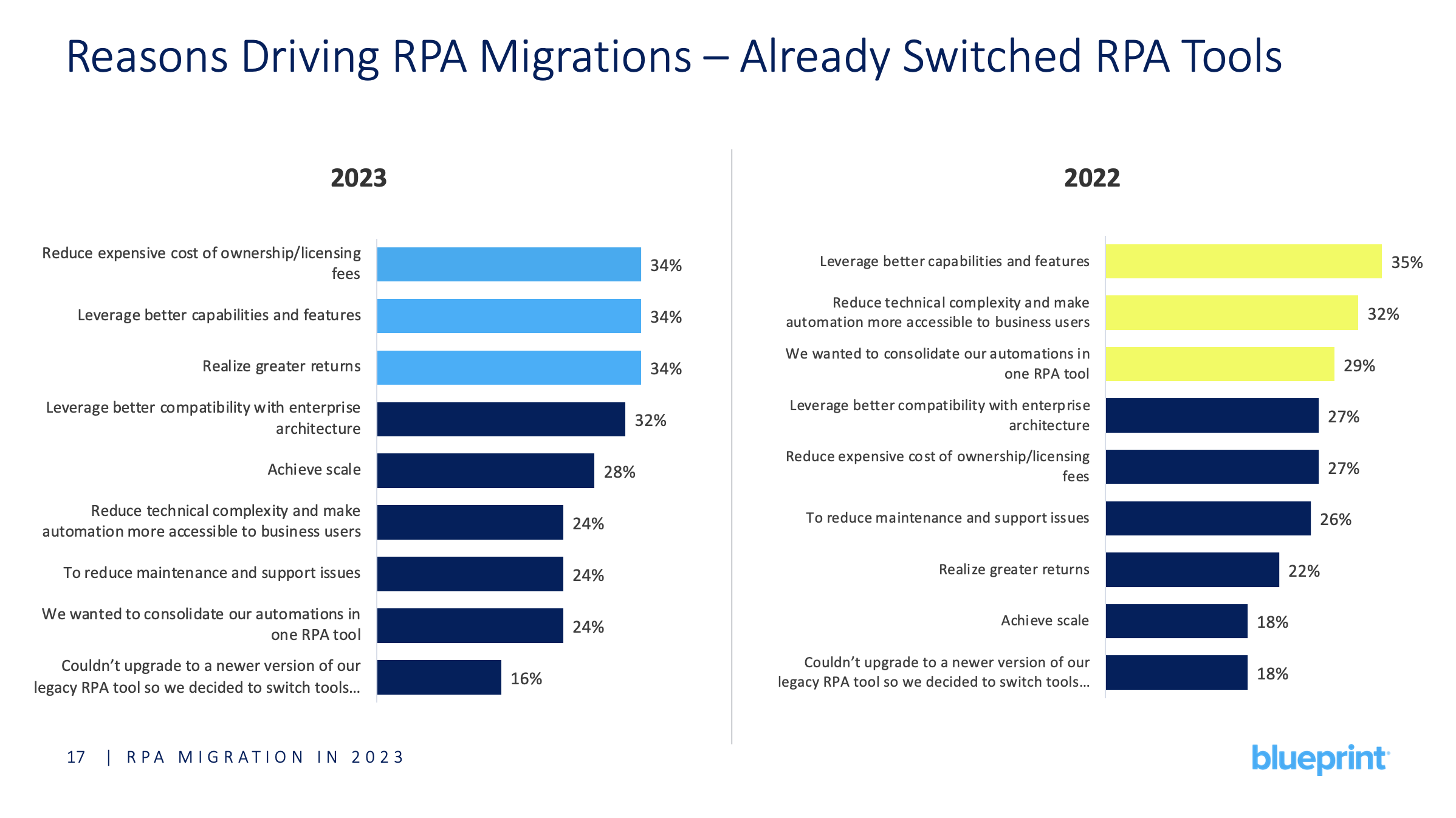 The main reason reported was to reduce the expensive cost of ownership and licensing fees of legacy RPA platforms. In Blueprint’s 2022 research on RPA migration, reducing the total cost of ownership for RPA ranked fifth on the list of reasons driving organizations to search for new RPA vendors. In 2023, it was number one.