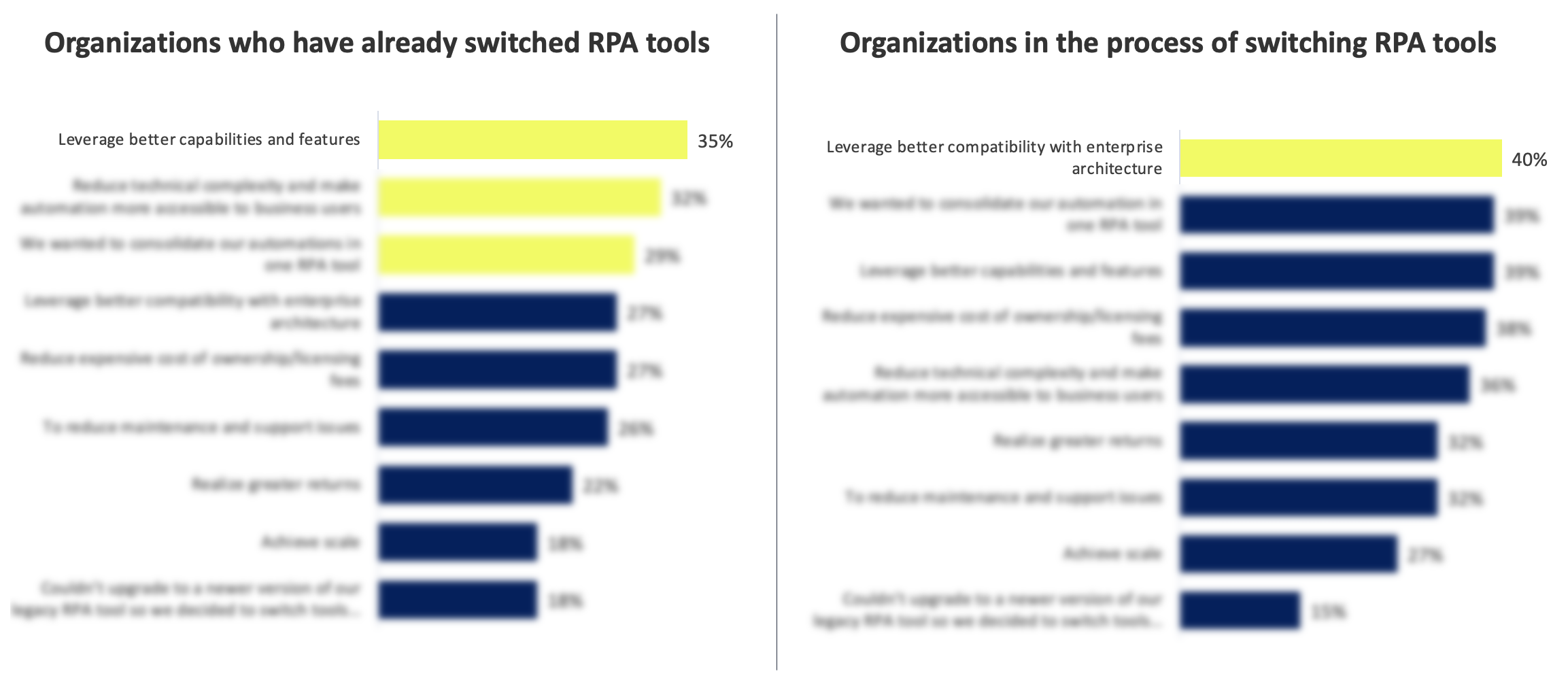 One of the primary reasons organizations are looking to switch RPA tools is to leverage better capabilities and features, reduce the total cost of ownership, and make automation more accessible with an improved and less complex UX.