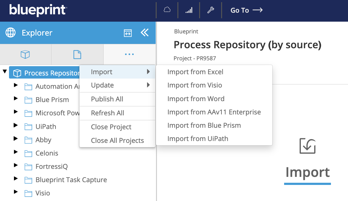 With Blueprint Integration, you can import processes from unstructured sources like Visio, process design documents (PDD), Excel, and even whiteboards. Consolidate all business process information in one platform for a complete 360-degree view of your organization.