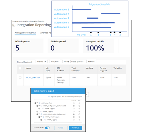 Export your automated processes into the most popular RPA tools. The process model, dependencies, images, and attachments can be accessed by RPA developers in Blueprint, facilitating higher-quality and faster development.Maintain a digital twin of your automations